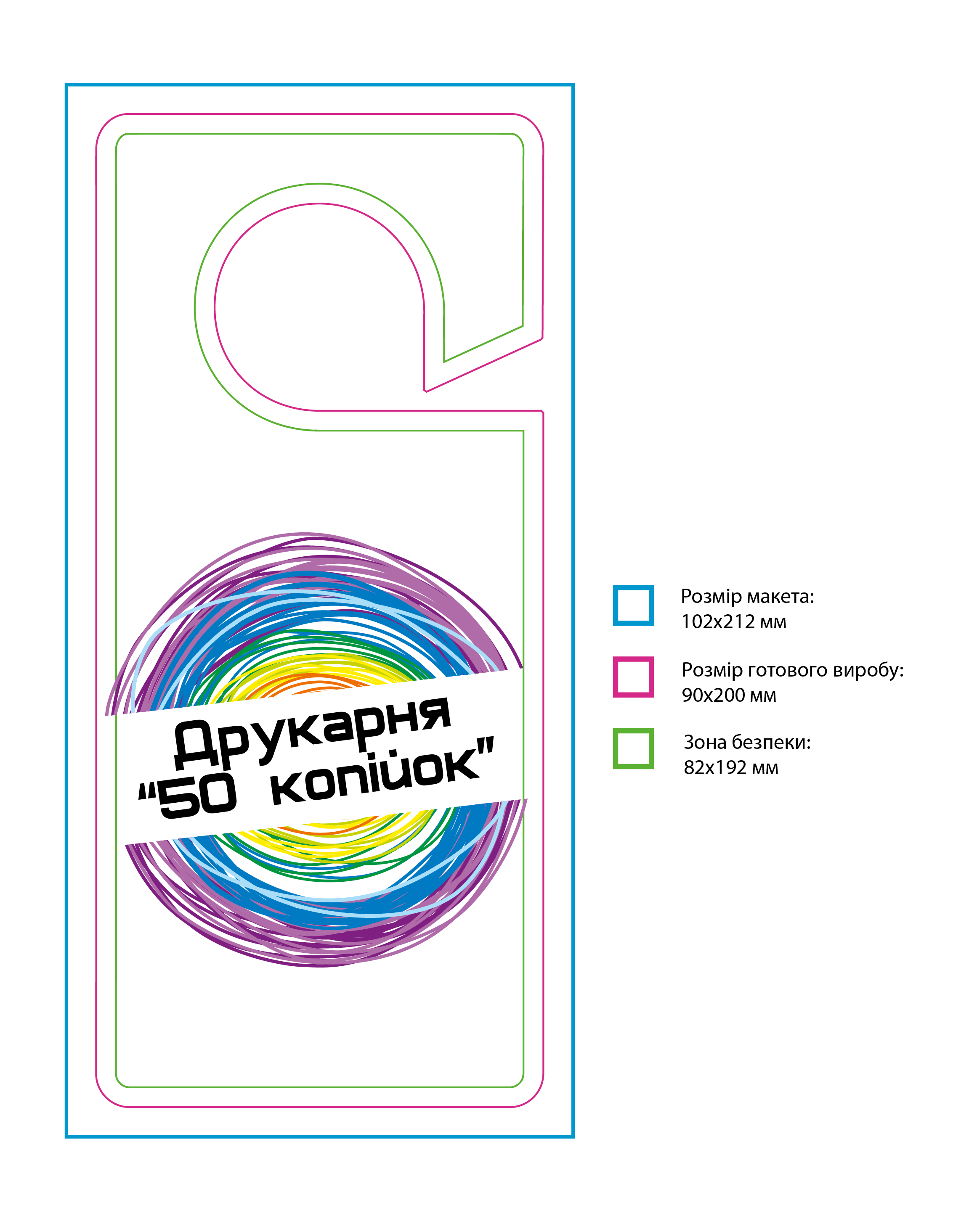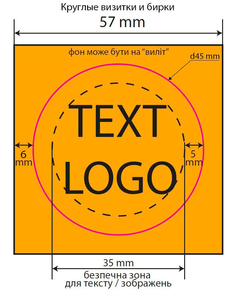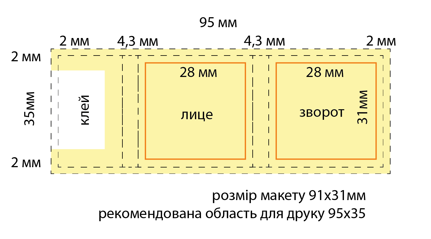 90×50 мм — подавати для друку 92×52 мм (по 1 мм з кожного боку під обріз). Важливі елементи публікації повинні розташовуватися не ближче 4 мм до краю обріза.