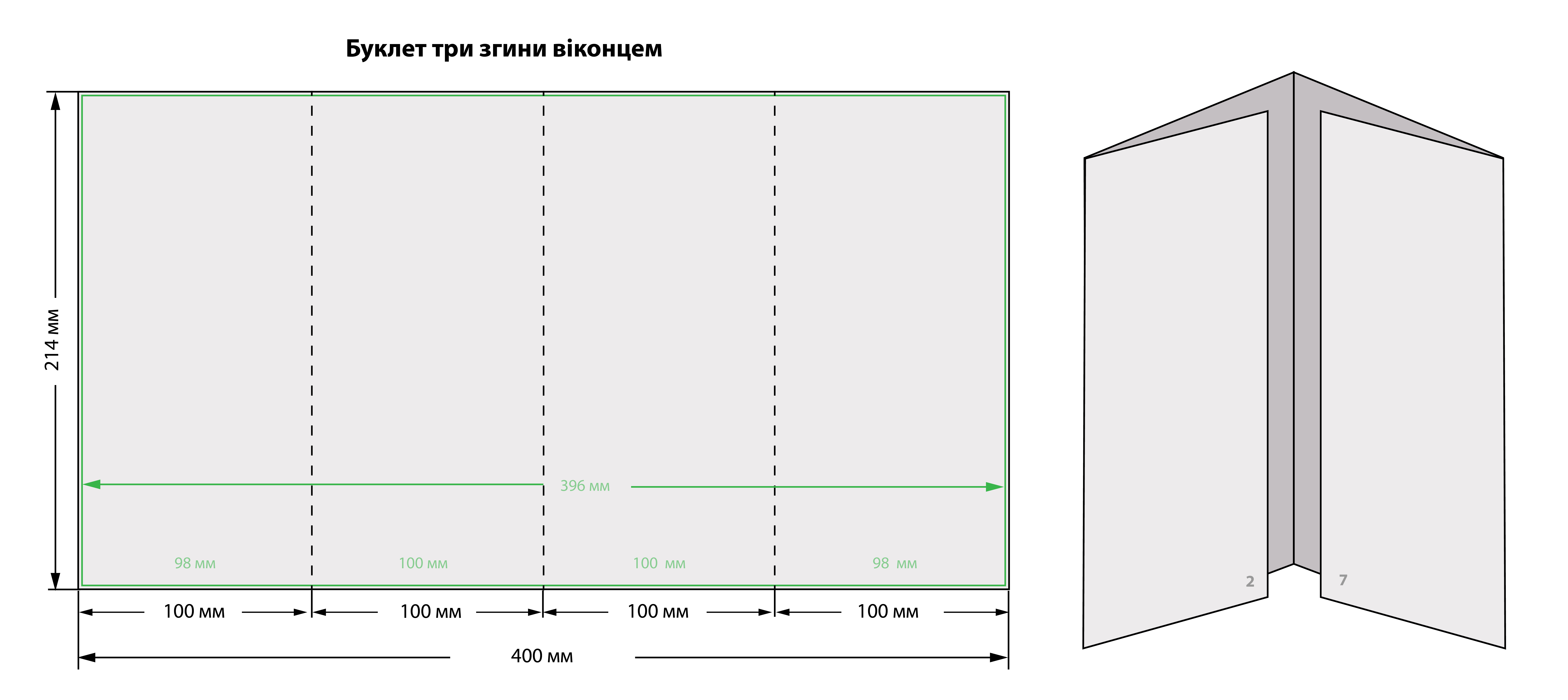 • В готовому вигляді 100×180 мм, подавати для друку 104×184 мм (по 2 мм з кожного боку під обріз).