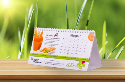 • Календар на 12 перекидних аркушів = 24 сторінки: кольоровий друк з однієї сторони + обкладинка: друк з однієї сторони + підложка з рекламним полем.