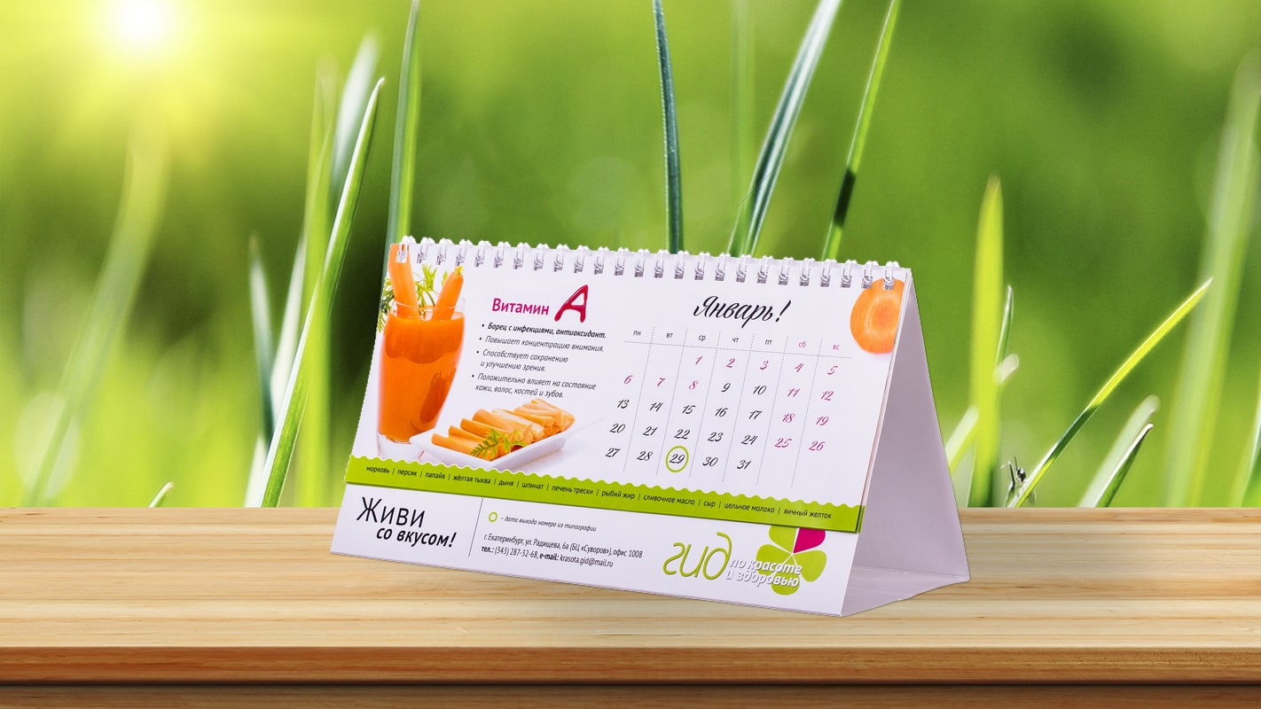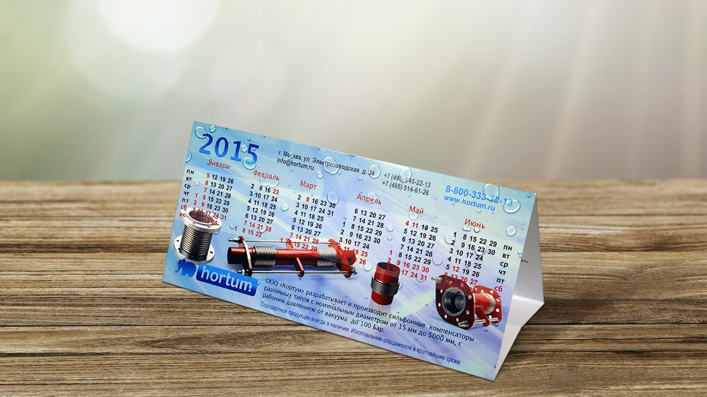 • Календар на 6 перекидних аркушів = 12 сторінок: кольоровий друк з обох сторін + обкладинка: друк з однієї сторони + підложка з рекламним полем.