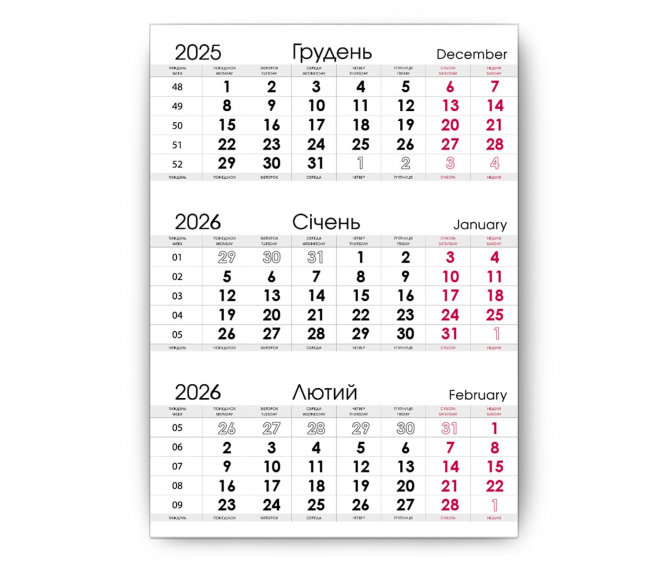 • Три календарні блоки: Світлий – папір офсетний 80 г/м² (зручно робити позначки); Синій та Сірий – крейдований 80 г/м².