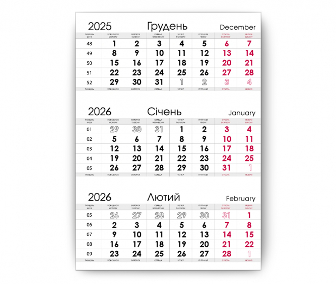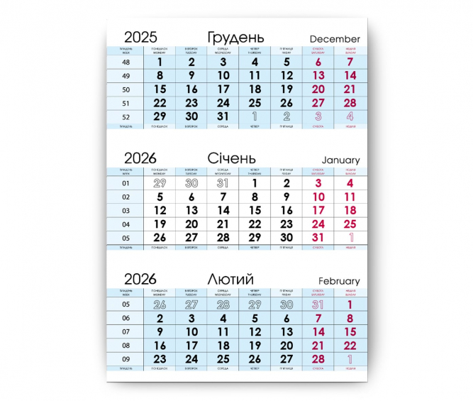 • Три календарні блоки: 297х140 мм, Світлий – офсетний папір 80 г/м² (зручно робити помітки); Синій та Сірий – крейдований папір 80 г/м².