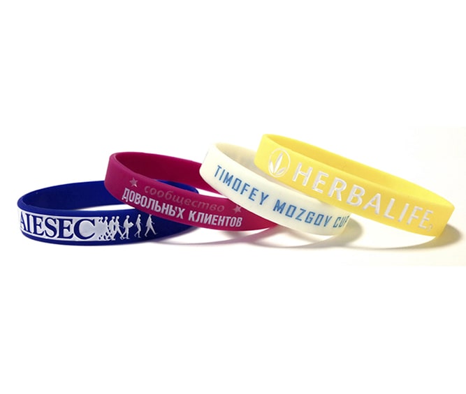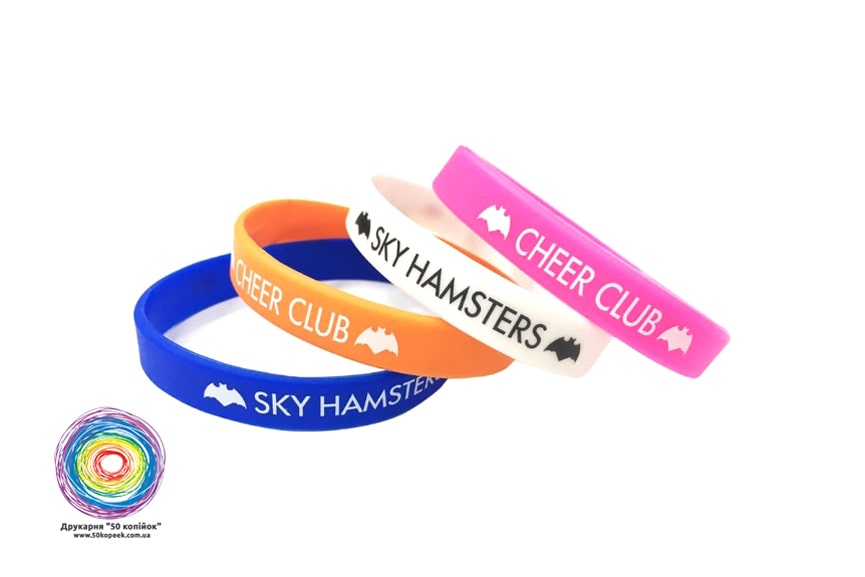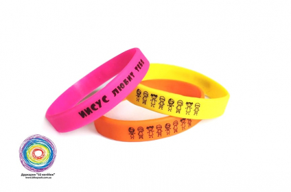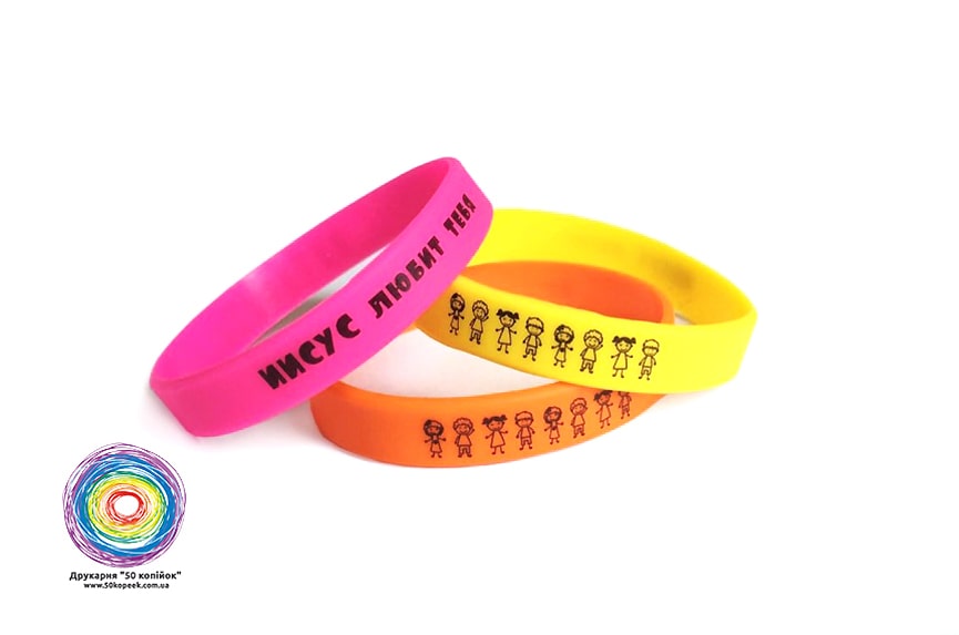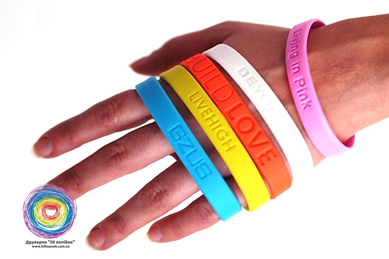 Друк, тиснення назовні та тиснення в середину зображень на кольорових силіконових браслетах