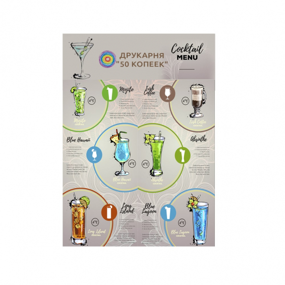 • Стоимость разработки дизайн-макета коктейльное меню А4 385 — 530 грн/1 стр.